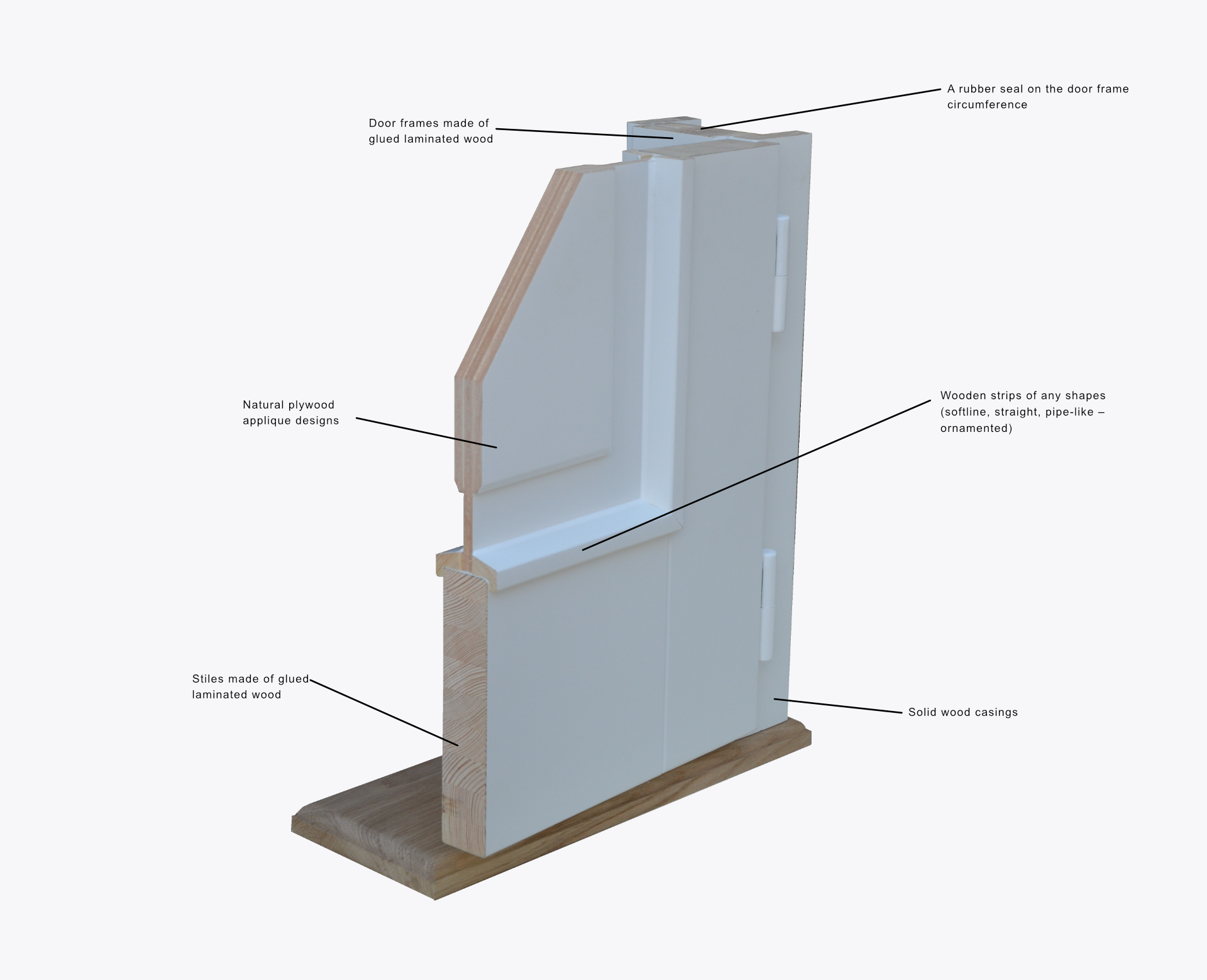 Stiles, wings, casings and crowns are made of solid or glued laminated wood. Additionally, in order to preserve uniform appearance of a wing and its durability, the wing is laid with natural wooden ply. The door may be made of pine, oak or exotic wood.