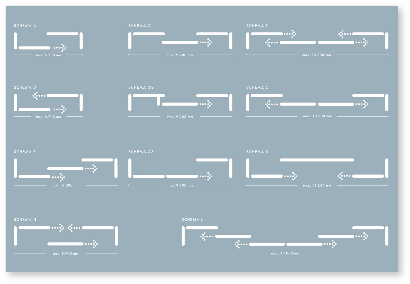 Maximum width of a sash is 3.33 m. Using an extended “L” scheme, we can obtain even 13 meters of free space with the window opened as part of one structure.