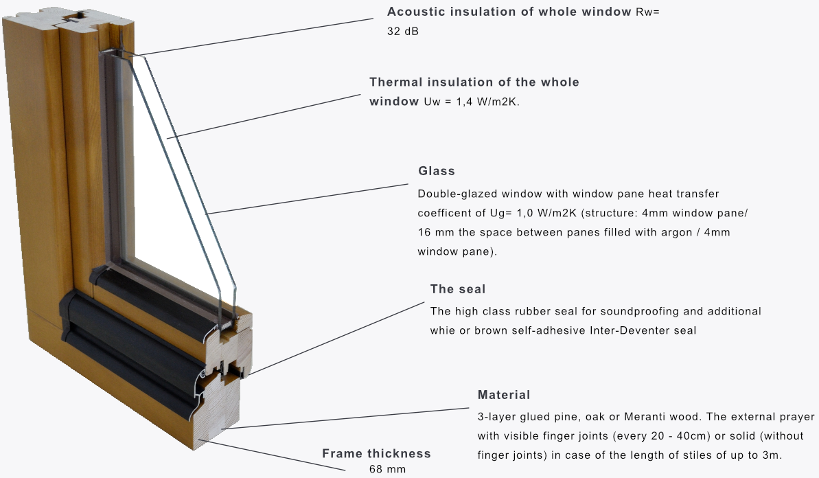 It is an offer for those looking for beautiful and good quality wooden windows at attractive prices. The integrated window pane facilitates cleaning. Owing to state-of-the-art technology used, the window wings do not have to be unscrewed for cleaning. The window has good thermal and acoustic parameters. The rich range of standard colours makes it possible to adjust appearance of the windows to interior design and building facades.