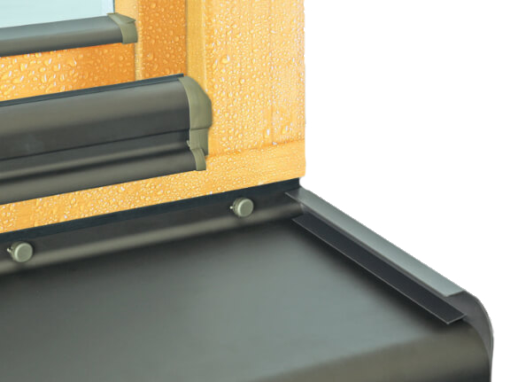 The aluminium drip on a frame and an additional drip on the wing in white (RAL 9016), silver (C0), brown (C34) or olive (C33). Optionally, drips may be use in any colours from RAL to match window colours.